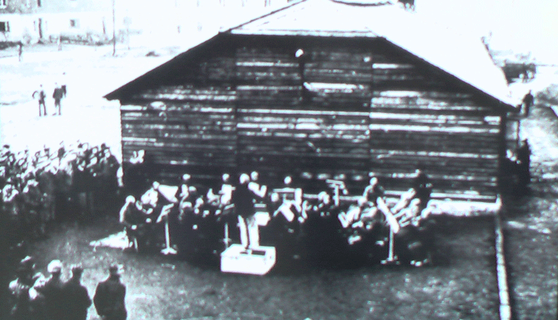 囚人たちの楽隊 聴いている囚人がいるがそんな余裕があるはずはないのでプロパガンダ用の写真だ