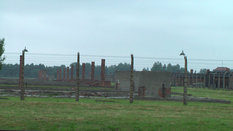 爆破された収容棟跡には暖炉の煙突のレンガだけが無数に残る