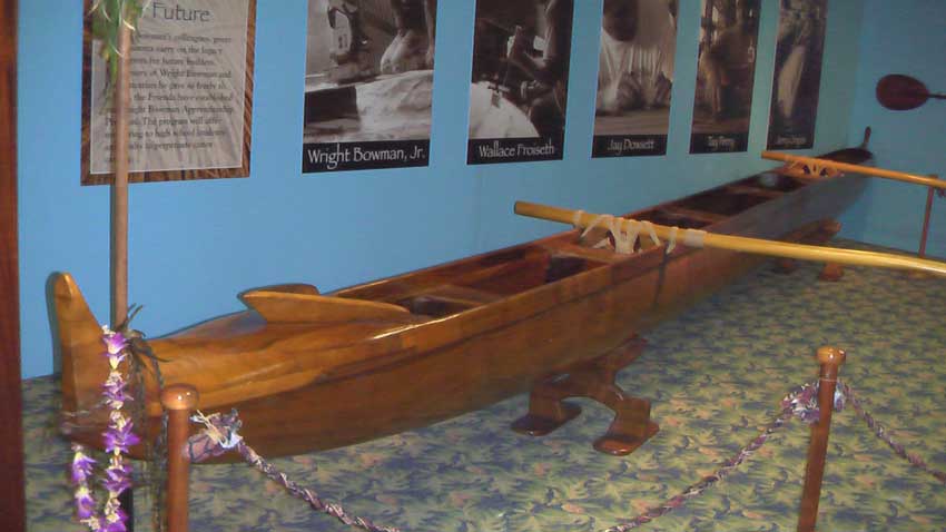 ホテルのロビーに昔のカヌーが展示してある