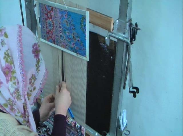 女の人が手作業で絨毯を織っている