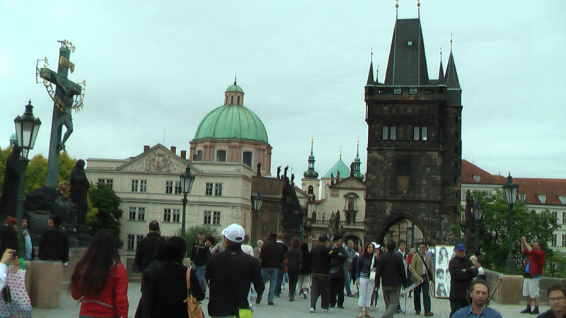 向こうの塔で橋は終わるが人の波は絶えない