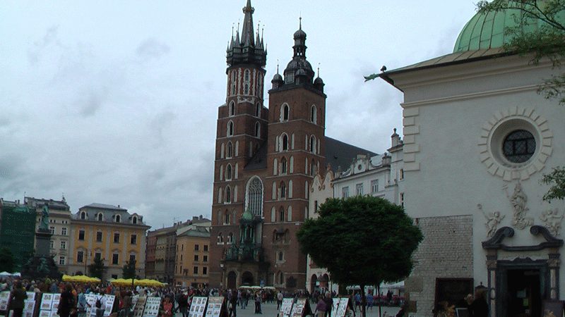 広場の向こうに聳える聖マリア教会 窓からラッパを吹くのが見えた