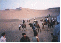 鳴沙山に着くと、折からの満月が夕空にぽっかり浮かんで、まるでロマンチックなお伽話の世界に入ったようで、砂ばかりでできた300mほどの砂山の美しさに魅せられた。そこで一人10元(120円程度)払って、らくだに乗せてもらい、1kmほど砂漠を歩いた。「月の砂漠をはるばると、旅のらくだが行きました。・・・」と口をついて出て、夢のような気分に浸ることができた。
