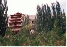 15kmくらい車で走ると、鳴沙山と三危山との接するあたりのオアシスの中に莫高窟はあった。