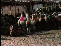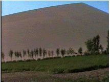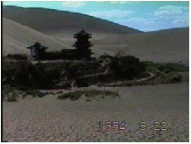 今日はそれだけではなかった。昼食のあと、1時間半ほど自由時間があったので、みんなは休憩するということだったが、私たち二人は昨夜暗くてよく見えなかった鳴沙山の麓の、月牙泉へタクシーを頼んで出かけた。タクシーは5分ほどで到着した。厳しい日射しの中を、昨夜らくだに乗った鳴沙山の麓を歩いた。真っ昼間の36゜cという暑さも、乾燥しているので、それほどには感じない。らくだの群を尻目に、鳴沙山の昼間の美しさをビデオカメラに収めながら歩いて、月牙泉に着く。
