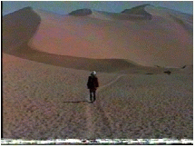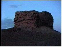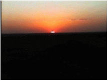 ところで、今日のハイライトは何と言っても陽関の遺跡を染めて沈む夕陽だった。ゴビ砂漠の中を延々と一本のシルクロードが走る。今まさにシルクロードを走っている、という感慨とともに、肌をなでるそよ風が何とも爽快だった。砂漠の中を一直線に貫くシルクロードは、陽関の遺跡の辺りでは舗装されていて、結構トラックなどがすれ違って行った。一方には鳴沙山、他方には地平線が連なり、敦煌から走ること70km。約1時間。オアシスの外れに陽関の狼煙台の遺跡があった。