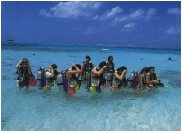 のホテルから2人の女の子を乗せて、かなり走ってポイントに着く。そこは内海の石ころの浜辺だった。他のダイビングスクールからも何人か来ていた。数人一緒に海に入る。初めての海での潜水。まずは深さ5mくらいのところでマスククリアー、耳抜き(水圧で鼓膜が圧迫されるのを、鼻をつまんで内耳に空気を入れて直すこと)、中正浮力の確保、手信号などの練習をする。30分間程度のダイブを2回やって今日は終わった。
