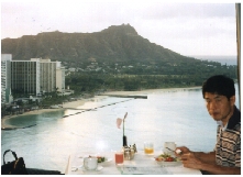 今朝だけは出発時間に制約がなかったので、少しゆっくりして、シェラトンホテルの30階のレストランにバイキングの朝食をとりに行った。6:30きっかりに一番乗りで、昨夜外からよく見えたエレベーターに乗って、一気に30階へ上ると、ダイアモンドヘッドが目の前にあり、ワイキキのビーチが眼下に広がり、サーファー達が朝の心地よい風の中で、サーフィンに興じていた。小さいながらも調ったうねりが、ワイキキビーチで高まり砕ける。その波の中で、若者達が戯れている姿に、30年ほど前、自分もサーフィンに夢中になっていたのを思い出し、かすかにときめくものがあった。