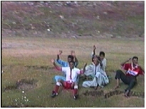 船に向かって手を振る若者たち