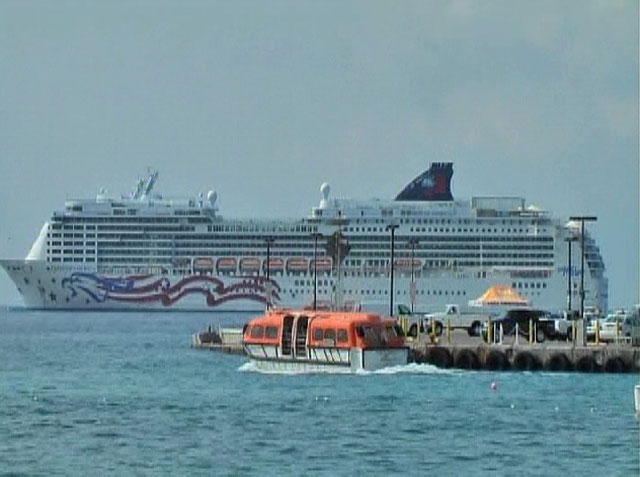 沖に停っているプライド・オブ・アメリカ号とシャトル運行する救命ボート
