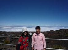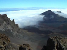 午前中はバスでハレアカラ火山に登った。サトウキビ畑の中を抜け、ハレアカラ火山への蛇行した道をどんどん登っていく。標高3,055mもある世界最大の休火山だ。まるで原始世界を思わせる火口の風景に歓声を上げた。「2001年宇宙の旅」の月面シーンの撮影がここで行われたというのも納得できる。