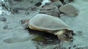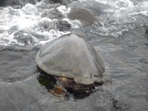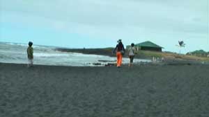 そして、黒砂海岸の標識を見落とさないように走っていたら、これもよくわかる標識が見つかって、入っていくと、前回来たときの記憶がよみがえり安堵した。駐車して、砂浜へ亀を探して歩いて行った。孫たちに見せたいので、亀がいますようにと祈るような気持ちで近づくと、砂浜には亀らしき姿はない。いないのだろうかと少し不安になりかけていたら、波打ち際の方を見ている人たちがいて、そこに近づくと、大きな亀が波にもまれながらまさに海に帰ろうとしているところだった。それも、あっちに2匹、こっちに2匹というふうに結構たくさんいたので、孫たちと興奮して見た。岩や石の間からなかなか海に出られなくて、波に流されたりもまれたりしていた。動作が悠長だと思った。