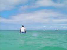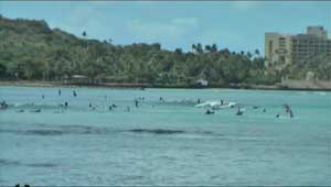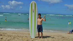 ゆっくりと朝食をとり、康二夫婦はダイアモンドヘッドに登山に行ったので、私と航大の二人はサーフィンをしにワイキキの浜辺へ出かけた。ホテルからビーチは近いと思っていたが、いざ歩いてみるとかなり遠かった。1台のサーフボードを2時間で15ドルということで借りた。航大が水中カメラを持っているので、海の中に浮き輪で入り、ビデオを撮ってもらいながらサーフィンに挑戦したが、波は来るものの、バランスがとれなくてとうとう一本も成功しなかった。1時間ちょっとであきらめて、航大をボードの上にのせてサーフボードの感触を味わわせてから、今日のところは引き上げた。