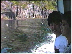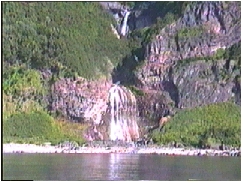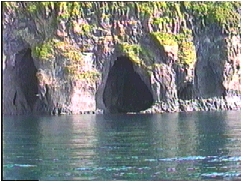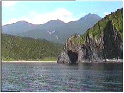 知床半島の100mもある断崖にはいろいろな景観が続く 遠く知床の山々が見える 2人の笑顔をカモメたちが追ってくる 硫黄岳から流れてくるカムイワッカの滝は硫黄分が多い滝だ