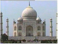 タージ・マハールはムガル帝国の皇帝シャー・ジャハーンが、亡くなった王妃のために作ったお墓で、真っ白な大理石のドームが青空に浮かび、全く左右対称な姿は、この世のものとは思えない美しさだ。