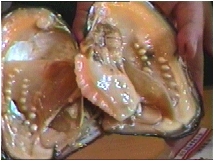 養殖の貝の中にたくさんの真珠が育っていて驚いた。