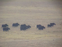 | ツォナ湖畔の放牧されたヤクの群れ(拡大) ナクチュ(那曲)まで下りても標高は4600m | |||||||||||