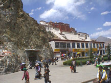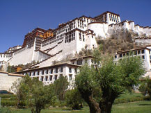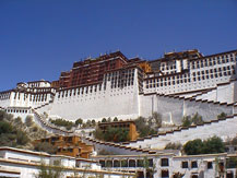 博物館を出るといよいよ待望のポタラ宮への巡礼だ。バスの窓から遠くその姿が見えたとき、ジンと熱いものがこみ上げてきた。ずっと前からこの写真を目にし、一度行ってみたいと思い続けていた場所だ。バスが正面に来たとき、こんな荘厳な建物がほかにはないと思った。歴史あるスペインの宮殿、華麗なるフランスやロシアの宮殿、美しいノイシュバンシュタイン城、それらのどれにも勝る荘厳さがこのポタラ宮にはある。紅山(マルポ・リ)という山の上に建っているということもあろう。焦げ茶と白壁のコントラストと横への広がりが、この宮殿を際だたせている。