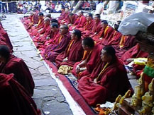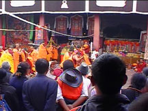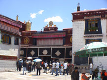 八廓街に面したジョカン寺の正面(拡大) 折からの法要の様子を見守る信者たち お坊さんたちの読経がしめやかに響いていた(拡大)