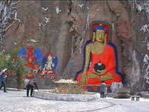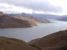 ジョカン寺の観光が終わると、いよいよラサを後にして、ヤムドク湖に立ち寄り、ツェタン(沢当)に向かう。バスで280kmも走ることになる。途中の道路沿いに、崖に彫られたたネタンの大仏を見た。その鮮やかな色は印象的だった。さらにヤルツァンポ河から離れ、ヤムドク湖を目指してカムパ・ラ(峠)を登りはじめる。ヘアピンカーブもある長く果てしない峠だ。ヤルツァンポ河は遙か彼方に遠ざかり、上へ上へと登っていく。標高が4749mになるまで登る。すると急に眺めが変わり、眼下に真っ青なヤムドク湖が見えた。遠くには雪を頂いたノイジンカンサン峰が見え、なんとも美しい。みんなで歓声を上げた。
